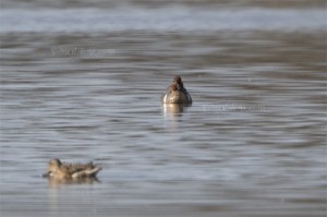 Möchte man sein Glück selber mal in den Rieselfeldern Münster versuchen oder gar in seinem Lieblingsfeuchtgebiet auf Nachsuche gehen, sollte man Krickenten-Trupps sorgfältig mit dem Spektiv durchschauen. Dies in der Hoffnung, doch mal einen senkrechten weißen Brustseitenstreifen statt eines waagerechten Weißstreifens auf den äußeren Schulterfedern zu sehen. Die auffallend breite weiße, senkrechte Linie – von manchen auch “Positionslichter” genannt – war bei der männlichen Carolinakrickente, die sich im Prachtkleid befand, jedenfalls sehr gut zu sehen. Die waagerechte weiße Linie der äußeren Schulterfedern fehlte und auch die Kopffärbung war etwas dunkler. Dadurch wirkt die Kopfform „voller“. Bis vor einigen Jahren wurde die Amerikanische Krickente als nordamerikanische Unterart der Krickente (Anas crecca carolinensis) gehandelt, jetzt wird sie aber als eigene Art (Anas carolinensis) angesehen.