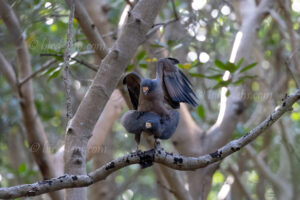 Although said to be ubiquitous I did not encounter any Rufous Crab Hawk (Buteogallus aequinoctialis) yet. This must change. So, I play the somewhat strange call with the help of a loudspeaker. The reaction is fast. From under the canopy of the tree in front of me, someone is calling. But I cannot see the bird. Suddenly, after another call from the tape a bird flies with elegance between the branches of the canopy and lands on the other side of the concrete bridge through the mangrove jungle. Immediately I see, there is another raptor on a thick branch of a mangrove tree. I see them—two large raptors perched close together, tails fanned, wings slightly lifted. One leans in. A quick display. Then they lock in a synchronized bow. The Rufous Crab Hawk is in courtship.