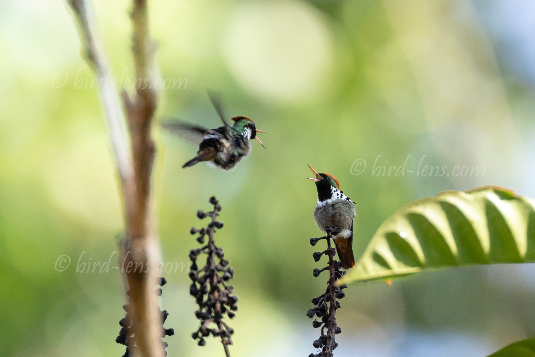Inzwischen wurde aus dem Vormittag Mittag und im Wald war es ruhiger geworden. Trotzdem blieben wir, wo wir waren – fünfundvierzig Minuten lang anfangs im Schatten dann zunehmend im Tageslicht, und beobachteten das Treiben dieses winzigen Kolibris. Dann, ohne Vorwarnung, erschien ein anderes Männchen. Es näherte sich tief, den Kamm gesenkt, eindeutig eine Geste der Unterwerfung. Das territoriale Männchen duldete dies einige Sekunden lang, doch die Stimmung schlug schnell um. Der Neuankömmling richtete sich auf, schüttelte den Kopf und schoss vorwärts, als wolle er die Entschlossenheit seines Besitzers testen. Die Reaktion kam sofort und entschieden: Das ansässige Männchen startete einen schnellen, aggressiven Sturzflug auf seinen Rivalen zu. Meine Kamera war bereits erhoben, und ich hielt die Konfrontation Bild für Bild fest – eine kurze, aber perfekte Abfolge von Flugmanövern.