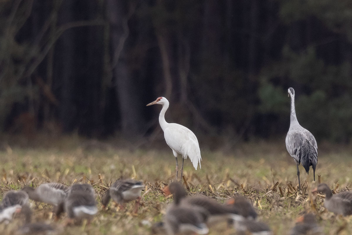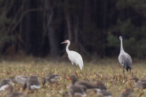 A normal, dirty November day. In a field Common Cranes (Grus grus) are feeding on corn with Grey Geese (Anser anser). In the middle of flock, there appears a completely white bird that also seems to be larger. My heart seems to stop. There are actually only two species of crane in the world that have almost exclusively white plumage. The Siberian Crane (Leucogeranus leucogeranus or Grus leucogeranus) and the Whooping Crane (Grus americana). Grus leucogeranus in particular has become very rare. It is also native to Asia and the other white crane to North America. So it would be a great rarity to spot a white crane here in Europe. A short time later, however, when looking through the spotting scope, it is clear that the white crane in the field belongs to the native Crane species, the “normal” Crane, also known as the Grey Crane.