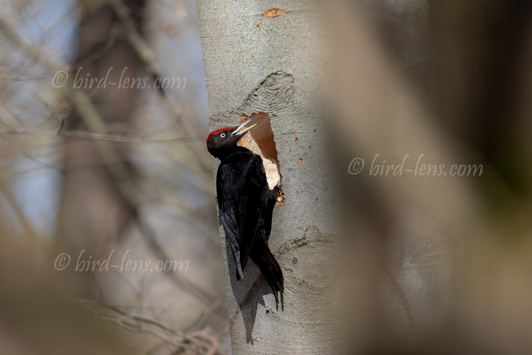 Es ist ein klarer Morgen im Wald. Nach dem ersten Regen im Monat März riecht die Luft nach feuchter Erde. Und dann hört man es: ein rhythmisches Klopfen, hart und gleichmäßig. Wenn man stehen bleibt und lauscht, wird schnell klar, woher es kommt. Von einer gar nicht so alten Buche am Rand eines Auenwaldes kommt dieses tiefe, kraftvolle Hämmern. Nicht das kurze Trommeln eines kleinen Spechts wie dem Buntspecht (Dendrocopos major), sondern ein lautes, regelmäßiges Klopfen, das durch den ganzen Bestand hallt. Nachdem ich mich einen freien Blick durch das noch unbelaubten Waldstück erarbeitet habe, und in die Runde schaue, entdecke ich ihn: einen großen schwarzen Vogel, der sich an die Buche klammert. Mit kräftigen Schlägen arbeitet er sich in das Holz hinein. Holzspäne fallen zu Boden. Der Schwarzspecht (Dryocopus martius) scheint hier gerade eine neue Bruthöhle anzulegen. Es ist ein Männchen, wie man anhand der Ausdehnung der roten Kopfplatte erkennen kann. Er klammert sich an die Rinde, stemmt sich mit dem Schwanz ab und hämmert mit erstaunlicher Vehemenz in das Holz.