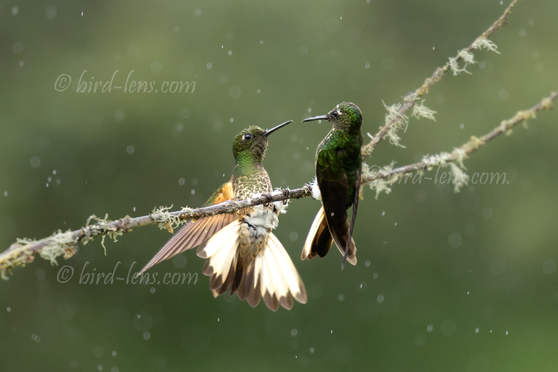 Ich stehe schön geschützt unter einem Zelt mit tief herunter gezogenem Dach. Es regnet in Strömen. Am Kolibri Feeder war schon eine Menge Action. Aber jetzt scheint es still zu seine. Doch dann wird die Stille jäh unterbrochen. Zwei Fahlschwanzkolibris (Boissonneaua flavescens) sitzen im strömenden Regen auf einem Ast im wunderschönen Glamping-Resort „El Color de mis Rêves“ im kolumbianischen Departamento Caldas. Einen Moment lang herrscht absolute Stille, fast meditativ, und im nächsten Moment ist Action zu verzeichnen. Plötzlich verliert einer der Kolibris offensichtlich die Geduld. Er springt in die Lust, verharrt einen Sekundenbruchteil in der Luft, flattert mit den Füßen voran und dann wird die vormals so traue Zweisamkeit jäh unterbrochen. Eine plötzliche, heftige und aggressive Attacke. Dies ist kein Zufall. Es ist ein persönlicher Kampf.